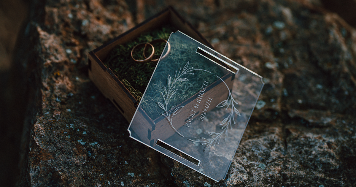 Esküvői gyűrűtartó dobozunk elegáns és időtálló kialakításával tökéletes kiegészítője lesz a nagy napotoknak, ahol a gyűrűitek biztonságban és stílusosan pihennek. A prémium minőségű fából készült dobozt egy 3 mm vastag, gravírozható plexi fedél teszi egyedivé, amely személyre szabható, így tökéletesen igazodik az esküvőtök hangulatához. Anyaga: 4 mm vastag rétegelt falemez és 3 mm vastag plexi fedél ,Méret: 8,5x 8,5x cm