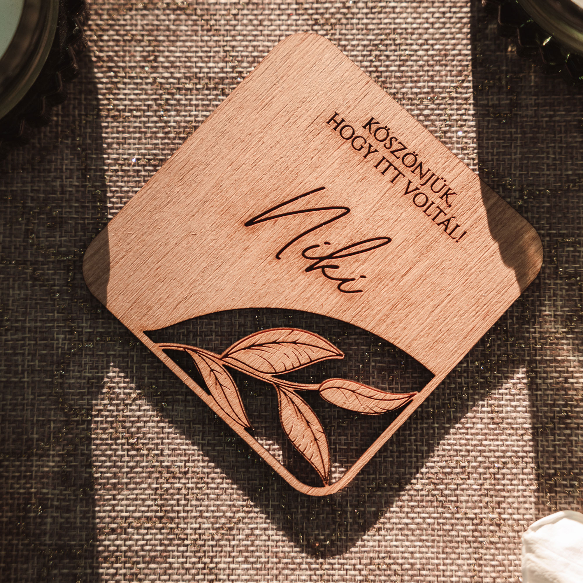 Ez a gravírozott ültetőkártya nemcsak stílusos megoldás az esküvői asztalok névsorrendjének kialakítására, hanem praktikus köszönőajándék is, amely poháralátétként szolgál a vendégek számára. Az ültetőkártyák tartós, 4 mm vastag rétegelt falemezből készülnek, természetes lazúrral kezelve, hogy az esküvői emlék hosszú ideig megőrizze szépségét. Teljesen természetes anyagokkal dolgozunk, így minden darab elegáns és környezetbarát. Egyedi igények esetén bátran vegyétek fel velünk a kapcsolatot.