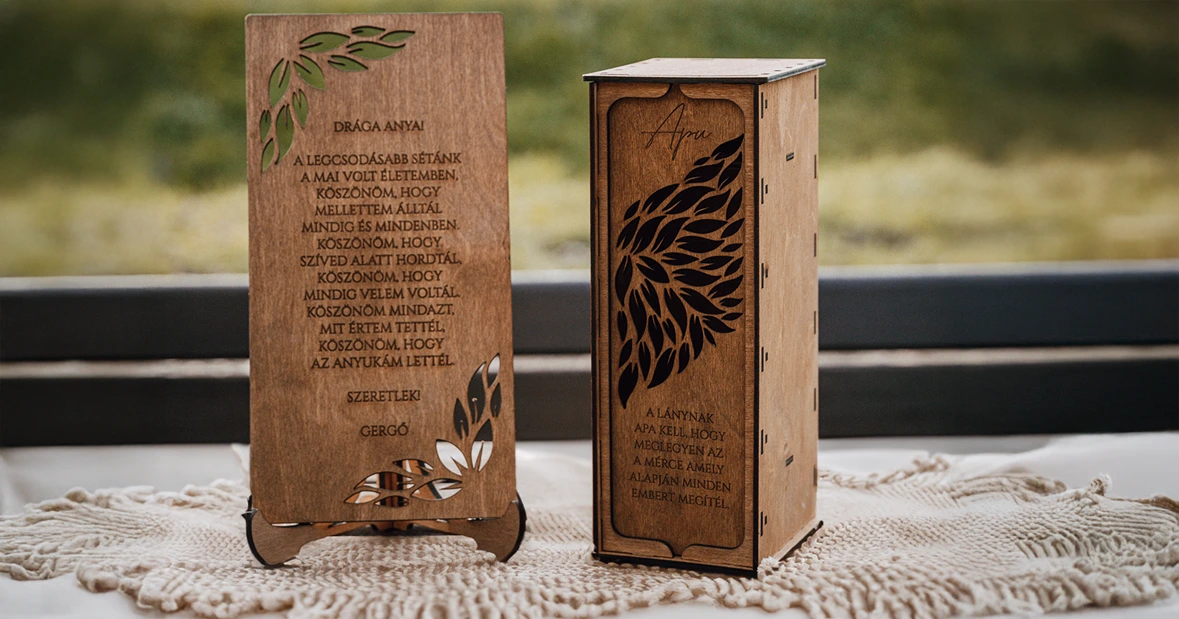 Az elegáns, gravírozott whiskeytartó doboz különleges és időtálló ajándék, amellyel méltó módon fejezheted ki háládat szüleid felé. A gondosan megmunkált fa doboz nemcsak praktikus tárolást biztosít, hanem esztétikus kiegészítője is az otthonnak. A termék megbeszélés alapján bármilyen szeszes italhoz igazítható, így az ital biztonságban és stílusosan helyezhető el benne. A fedélre gravírozott egyedi szöveg vagy üzenet személyessé és igazán meghatóvá teszi az ajándékot. Ez a kifinomult meglepetés hosszú időn át emlékezteti majd szüleidet arra, mennyire fontosak számodra.